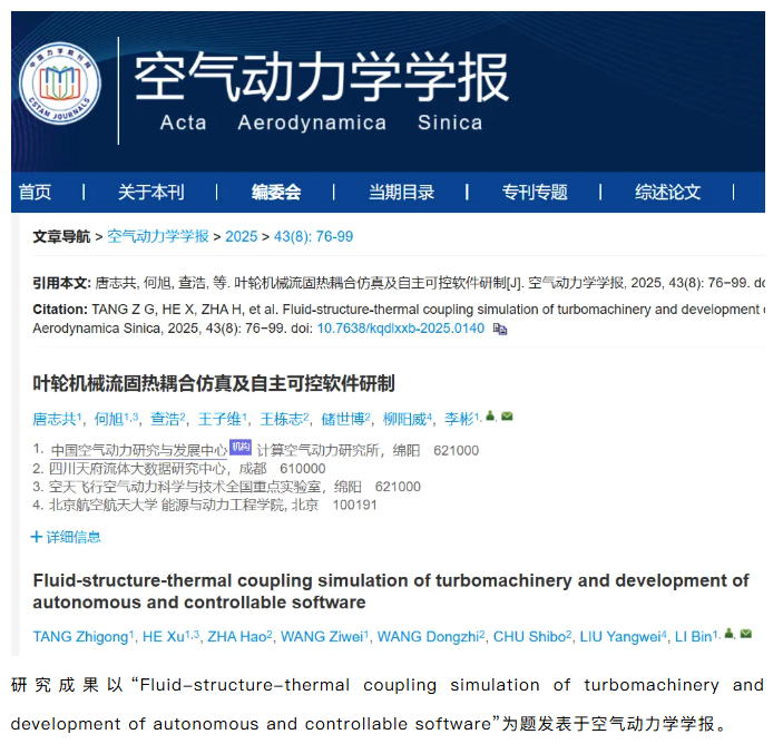 叶轮机械作为动力能源领域的关键设备部件,其性能和效率直接关系到动力系统的服役表现。随着高性能计算机系统硬件水平的高速发展,以及流体、强度和传热领域数值仿真能力的不断提升,流固热耦合仿真技术对于叶轮机械的设计优化、性能预测以及故障预防起着越来越关键的作用。北京航空航天大学、中国空气动力研究与发展中心、四川天府流体大数据研究中心、空天飞行空气动力科学与技术全国重点实验室对叶轮机械流体、强度以及流固和流热仿真领域的主要数值方法和挑战问题进行了分析,以国产自主涡轮动力叶轮机械流固热耦合仿真软件(AeroEngine Numerical Simulation, AENS)为载体,介绍了同构/异构流固热耦合仿真软件架构,以及高效的耦合算法和鲁棒的网格技术。通过典型叶轮机械AENS流固/流热耦合仿真结果与试验数据的对比分析,表明AENS具备在高温、高压、高转速条件下的流固热耦合模拟能力,其应用前景广阔,为叶轮机械正向多学科耦合设计提供了重要支撑。