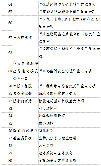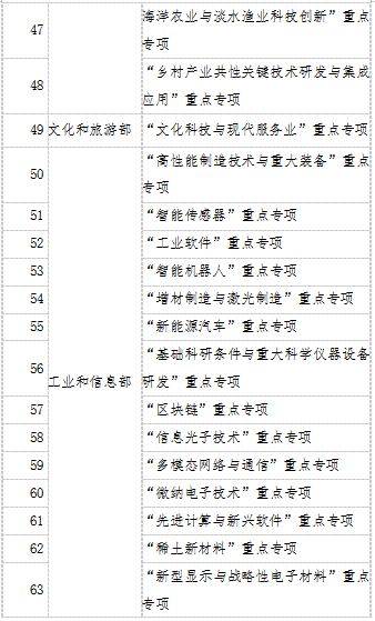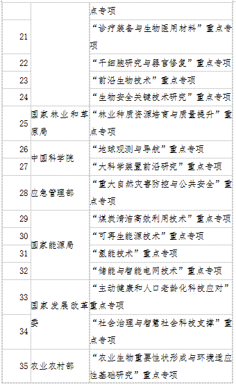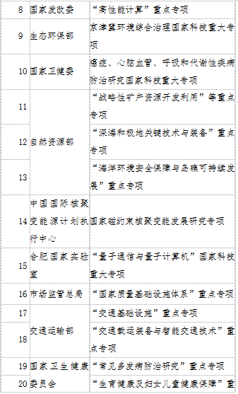 国家重点研发计划:针对事关国计民生的重大社会公益性研究,以及事关产业核心竞争力、整体自主创新能力和国家安全的重大科学技术问题,突破国民经济和社会发展主要领域的技术瓶颈,由原来的国家重点基础研究发展计划(973计划)、国家高技术研究发展计划(863计划)、国家科技支撑计划、国际科技合作与交流专项、产业技术研究与开发基金和公益性行业科研专项等整合而成。2024年共启动82个国家重点研发计划。